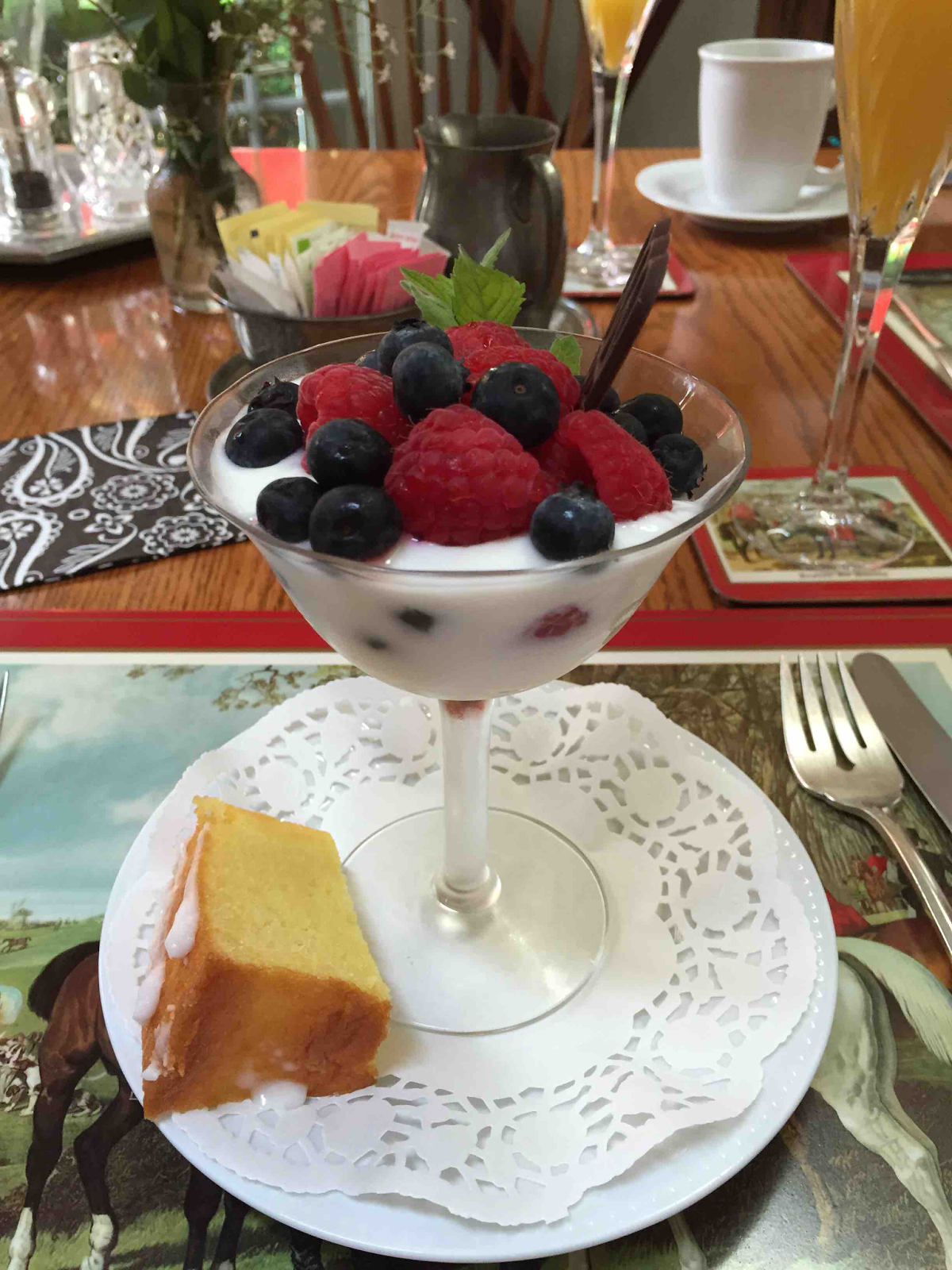 Upon my request, the focus was on savory rather than sweet, so we started with an asparagus-crabmeat quiche, ended with eggs nested in smoked ham – with this lovely yogurt parfait and lemon cake as the sweet intermezzo. Delicious!