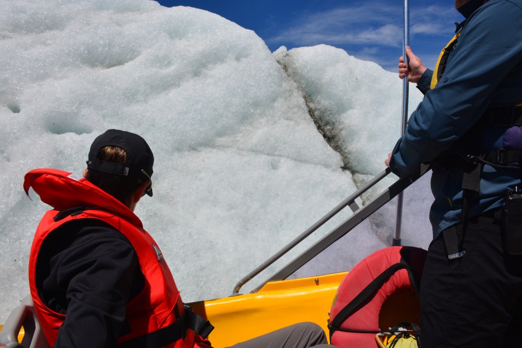 The bottom of the glacier can be seen in the photo at the top. It is not floating; the ice stretches hundreds of meters below the surface. It also stretches up and to the right into the mountains, which isn’t visible in this photograph. And yes those are rocks on the surface, likely 300 years old, carried by the force of the moving ice. Pieces of the glacier do break off and form ice bergs, as seen below.