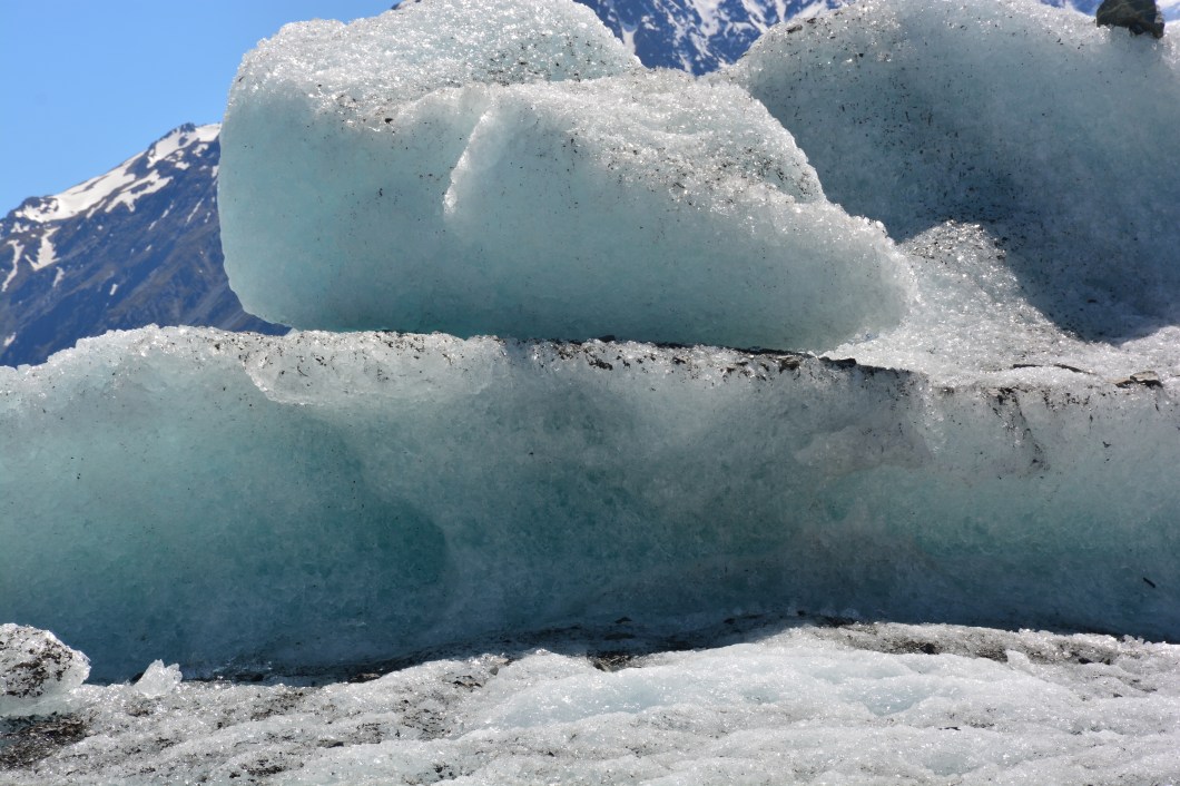 The bottom of the glacier can be seen in the photo at the top. It is not floating; the ice stretches hundreds of meters below the surface. It also stretches up and to the right into the mountains, which isn’t visible in this photograph. And yes those are rocks on the surface, likely 300 years old, carried by the force of the moving ice. Pieces of the glacier do break off and form ice bergs, as seen below.
