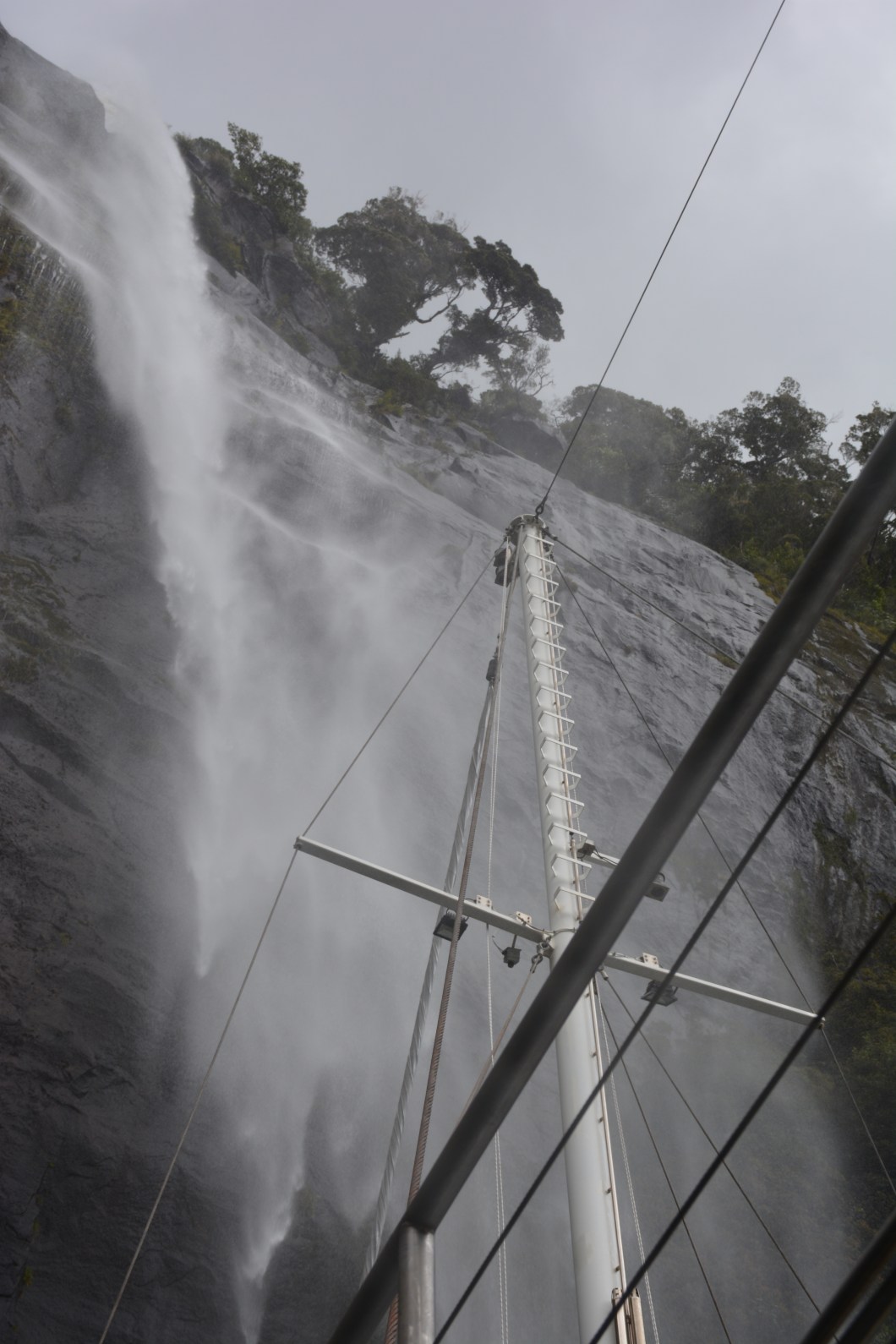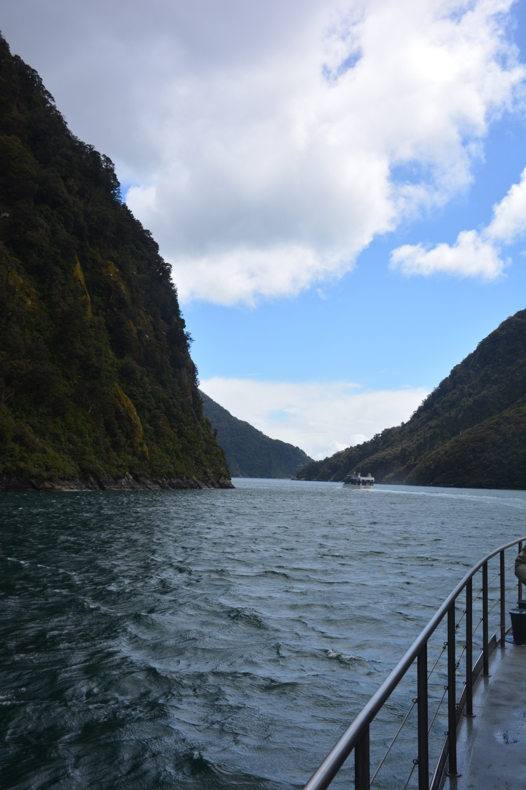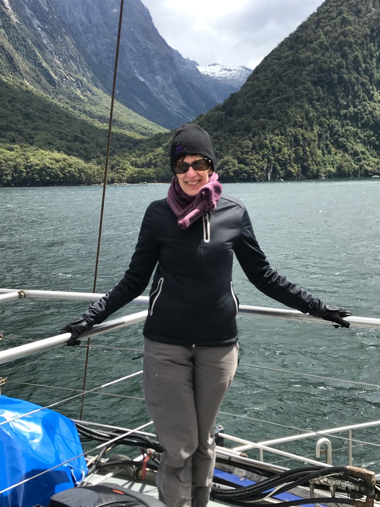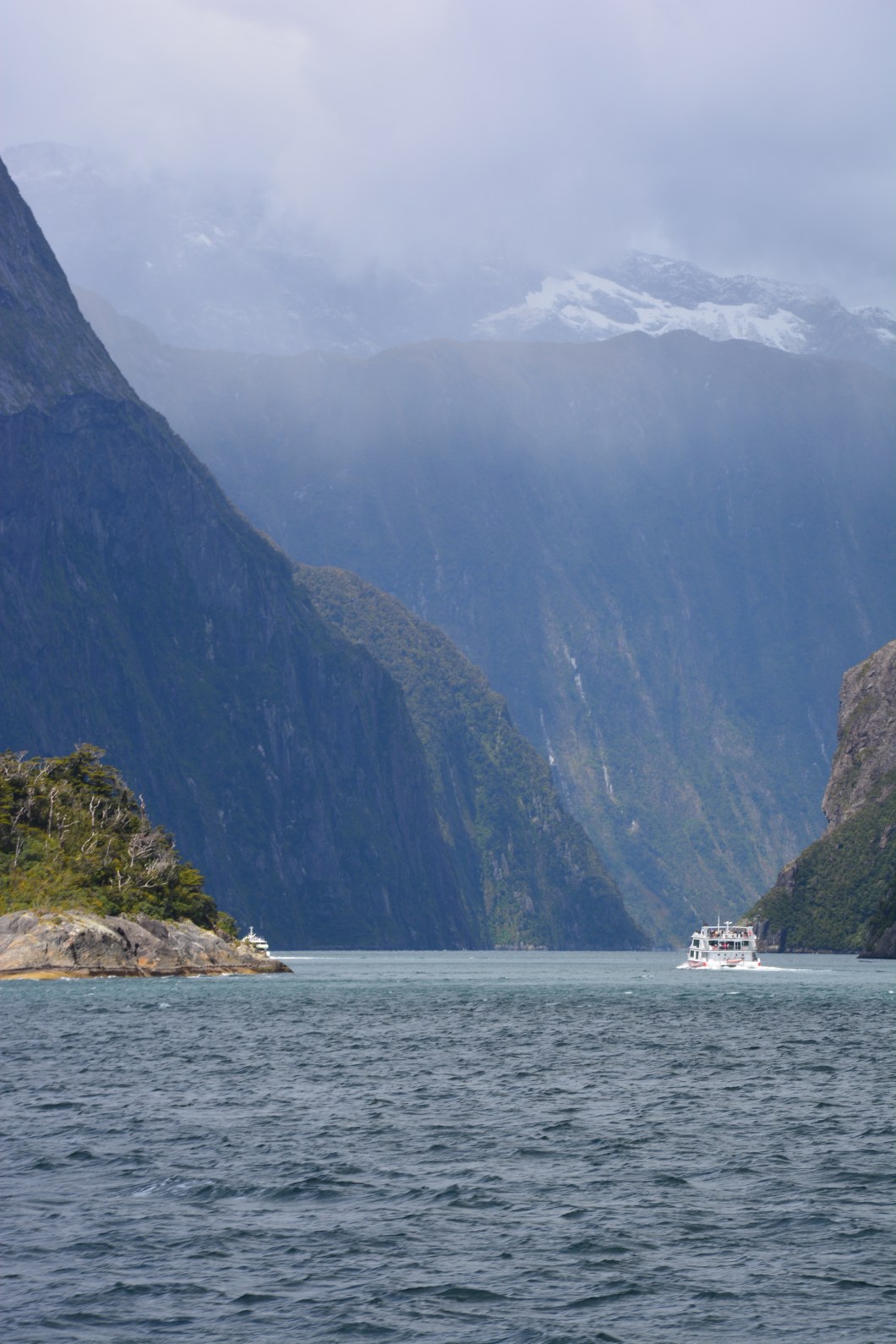 Now that we have dispensed with the adventure portion of Sunday’s journey to Milford Sound, on to the main event. It was simply awesome as advertised. The deep, steeply walled fiord is a site to behold. It was a chilly day, and it rained at times, but also cleared for long spells. We were dressed for the conditions and were comfortable. Rain can increase the number of waterfalls that cascade down the rocks. This is a “pictures can tell the story,” while not entirely capturing how beautiful the place is.