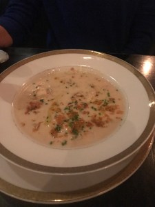 The pros include the lovely old bar area, with the wood paneling, red banquets, and tin ceiling. It has a great old-timey feel about it. You can just imagine people back in the 20s, 30s, 40s, or 50s dressed to the hilt, smoking and drinking. Food-wise, the current menu has been stripped to the basics. There is a good selection of oysters, and appetizers that harken to the old days. (When was the last time you saw Parker House Rolls on a menu? Do you even remember what Parker House Rolls are? I had to think about it.) But there are familiar selections, like New England clam chowder, wedge salad, snapper soup, fried oysters and deviled eggs, plus current faves like tater tots. The clam chowder was quite good, but I have to say I like the one I had at the Standard Tap pub in our neighborhood a bit better.