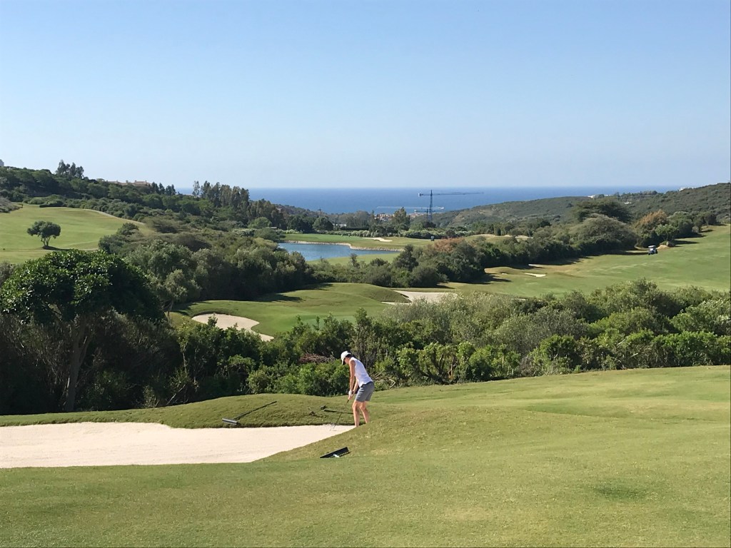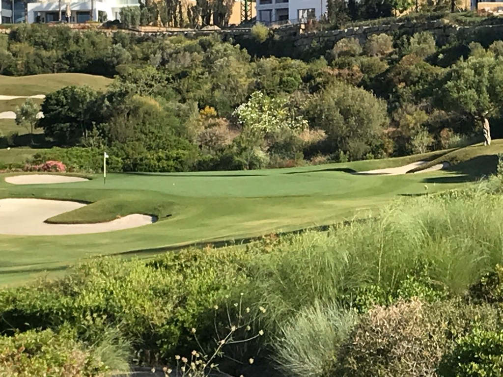 The purpose of the stay at Finca Cortesin on the Costa del Sol was to play a round of golf, and generally enjoy some R&R time after some serious touristing. We are back on the road tomorrow, but this was a good indulgence. I can’t say we played particularly well, but it was a challenging golf course. We didn’t play the more well-known Valderama because we were led to believe it was too difficult. But a couple we chatted with after the round told us they played the day before and thought it was easier than Finca. The main challenge of the latter is that it is a very hilly course and you might think you hit a decent shot, only to have in run off a slope into a more difficult area. Flat lies were not common is all I can say. But the vistas were beautiful, with the Mediterranean as a back drop, so what is bad about that. Pat liked that they brought out a bag of fruit on the front nine, and on the back they came around with freshly made gazpacho. Not your usual golf course snacks.