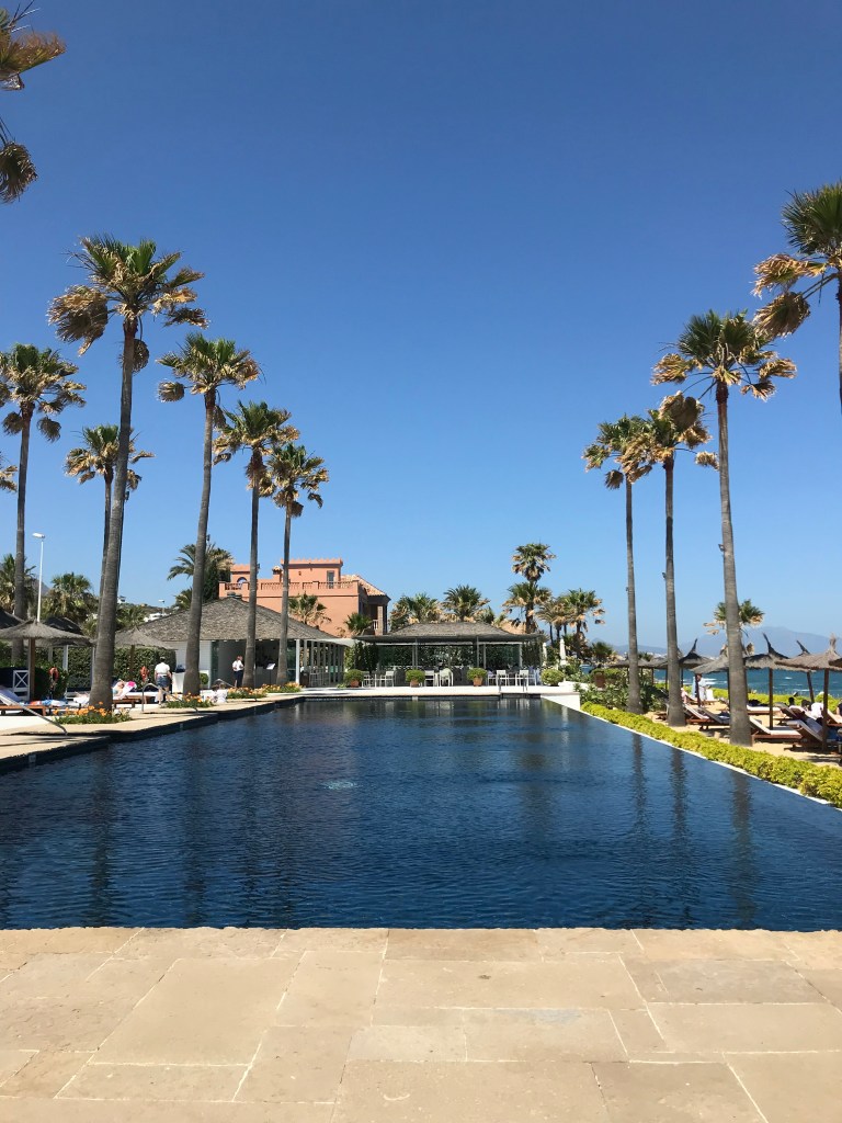Later we went to the beach club operated by the property. As they put it in their marketing brochure, “The Finca Cortesin Beach Club welcomes guests who seek some relaxation without relinquishing the exclusivity and elegance they deserve.” Holy lifestyles of the rich and famous. We belong to neither group but it was a pretty nice place to hang out, though we admit it was a splurge.The pool was salt water but chilly. The beach is actually kind of rocky, so we didn’t bother to go down but we enjoyed the air off of the water, the sun and the blue sky. All around a pretty good day.