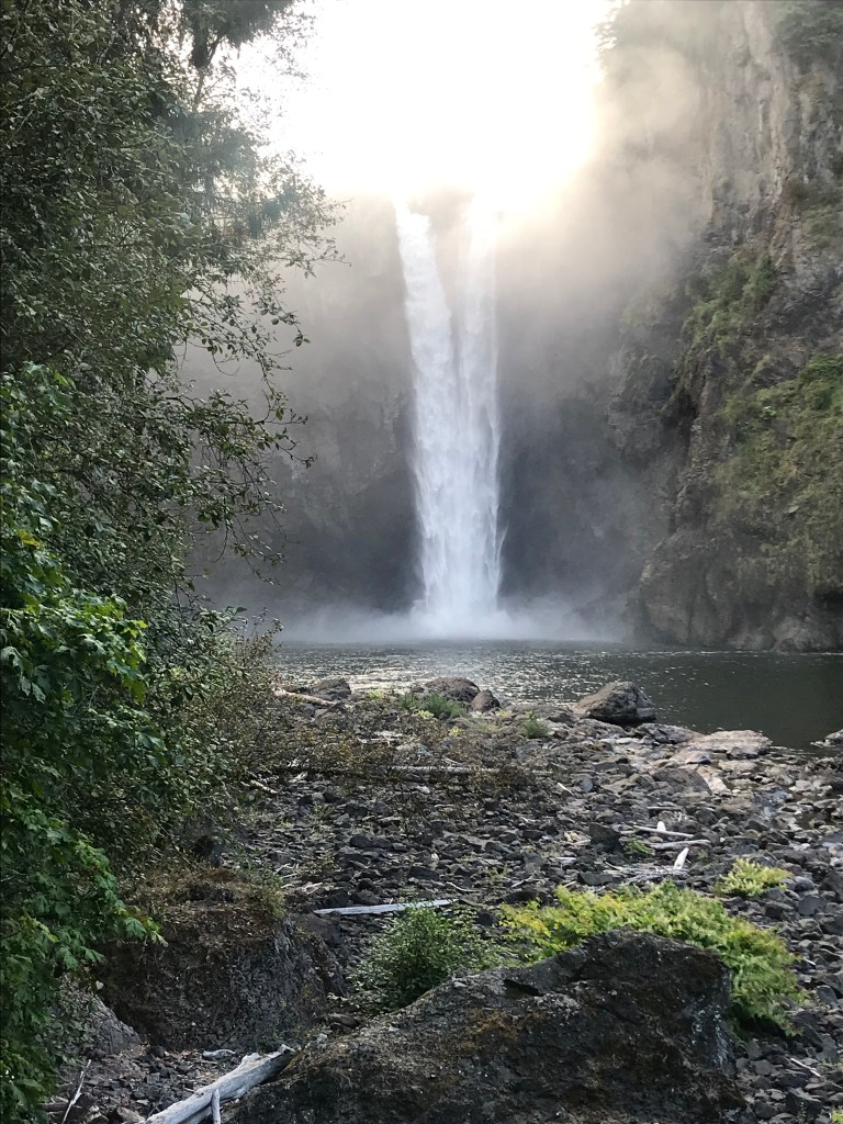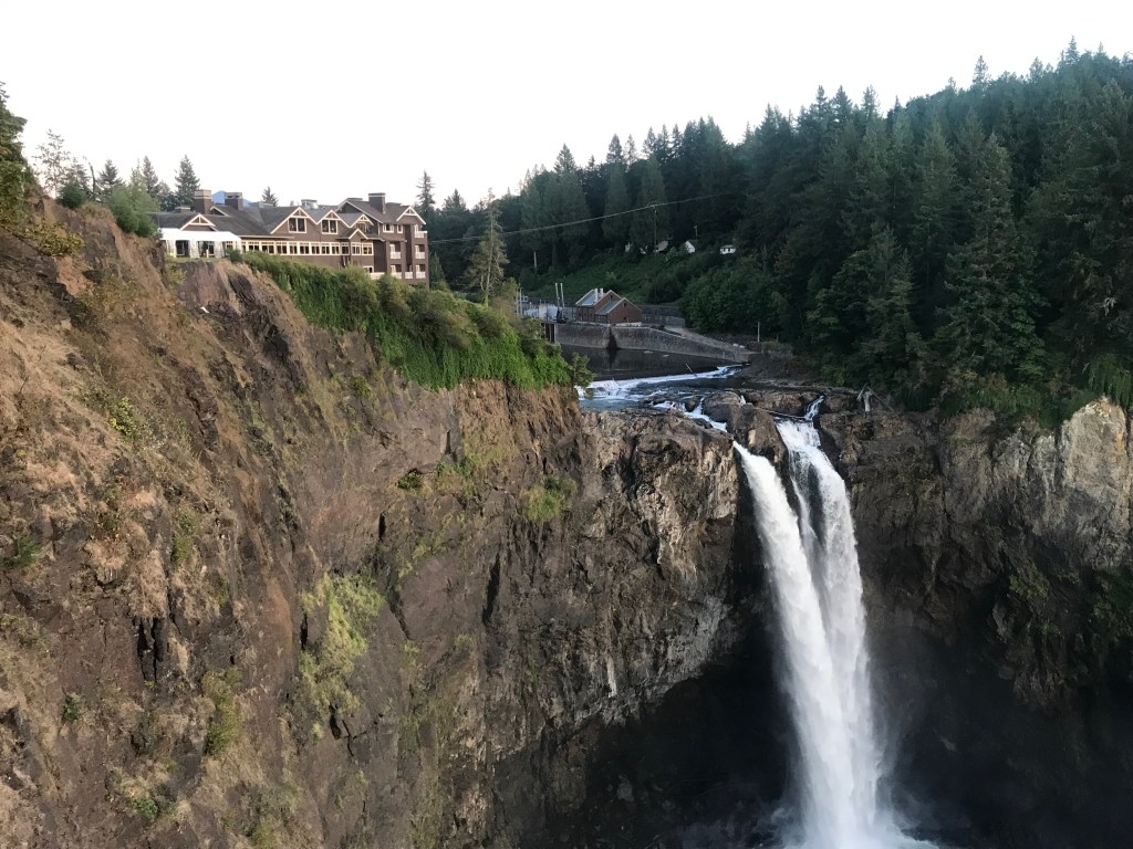 We arrived Wednesday evening at our final stop on this trip, the beautiful Snoqualmie Falls about a half hour east of Seattle. We are staying at the Salish Lodge & Spa, which one of my Seattle friends described as “upscale in a Pacific Northwest kind of way.” I will leave it to Pat to handle the actual hotel review, but an exterior shot of the property, similar to the one below, opens the 90s TV show “Twin Peaks,” in which it’s called the Great Northern. The real hotel isn’t as rustic as depicted in the show but it does feature a lot of wood accents.