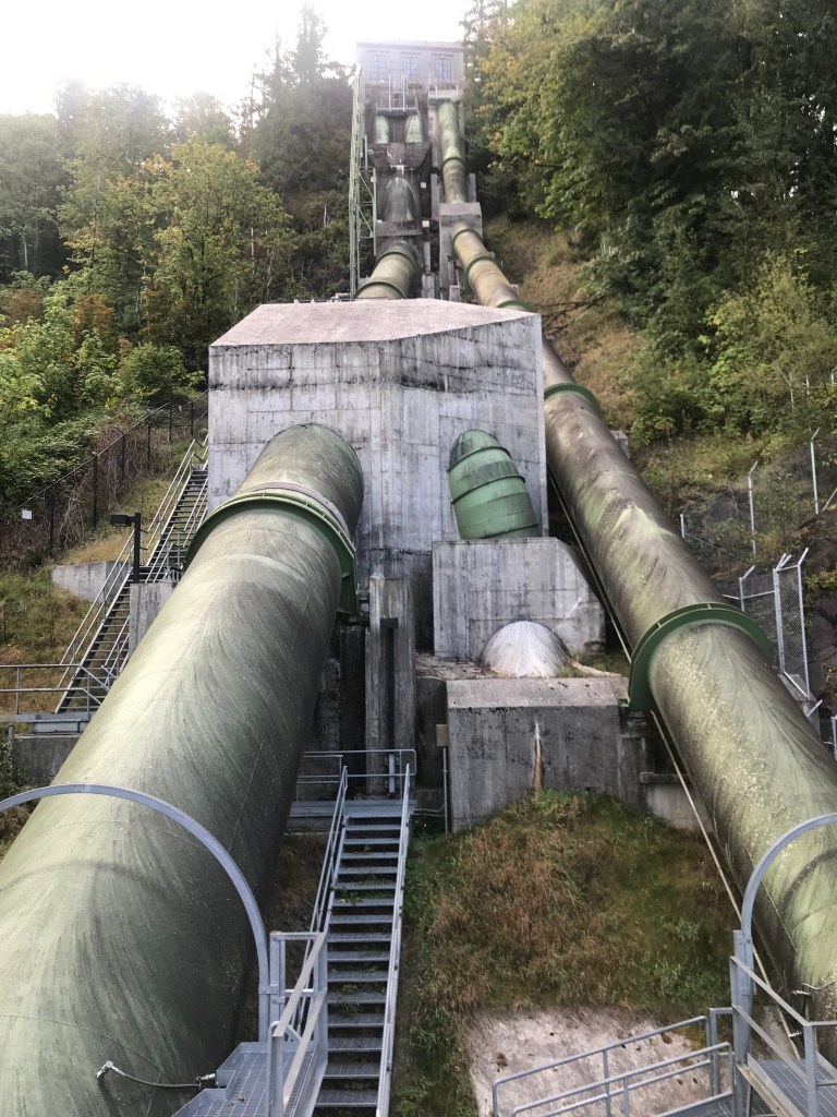 The title of the post refers to the fact the falls are 268 feet high. Fun fact that we didn’t know – That is higher than Niagra Falls, though obviously not as wide. The falls were first used to generate hydroelectric power around 1900 with the opening of the first plant; there are two generating stations now. The shot below shows the pipes that carry water to the lower station; we walked down to the river below the falls this morning.