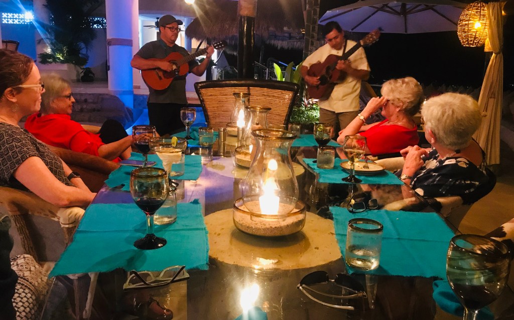 As is clear from the photo at the top, we did some entertaining. It’s the outgrowth of having booked the penthouse, but that’s OK. It was fun. The other two people are also friends of Vicki’s who she originally met in Houston but who now live outside of Denver. Actually, in the mountains near the Breckinridge ski resort. Needless to say, they had enough of snow and jumped at the chance to come here when a unit opened up on short notice. The musical interlude was a surprise, but Pedro and Lalo evidently enjoy doing it. Repeat visitors ask them to play.