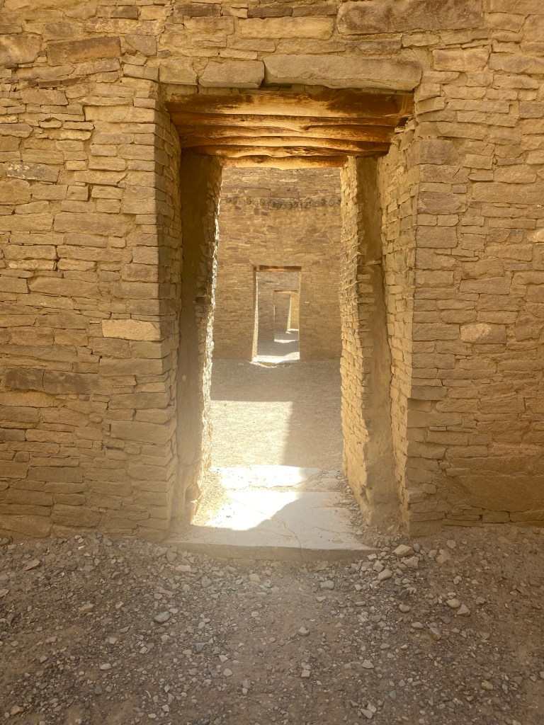 Chaco Canyon is a UNESCO World Heritage site, remarkable for its multi-storey great houses and elaborate engineering of both structures and roads. The buildings here were the largest in North America until the 19th century. The advanced engineering and architecture allowed, for example, the perfectly square doors and alignment shown in the photo below, where you can see five rooms from one doorway. There was also alignment with lunar and solar events, indicating their advanced knowledge of astronomy.