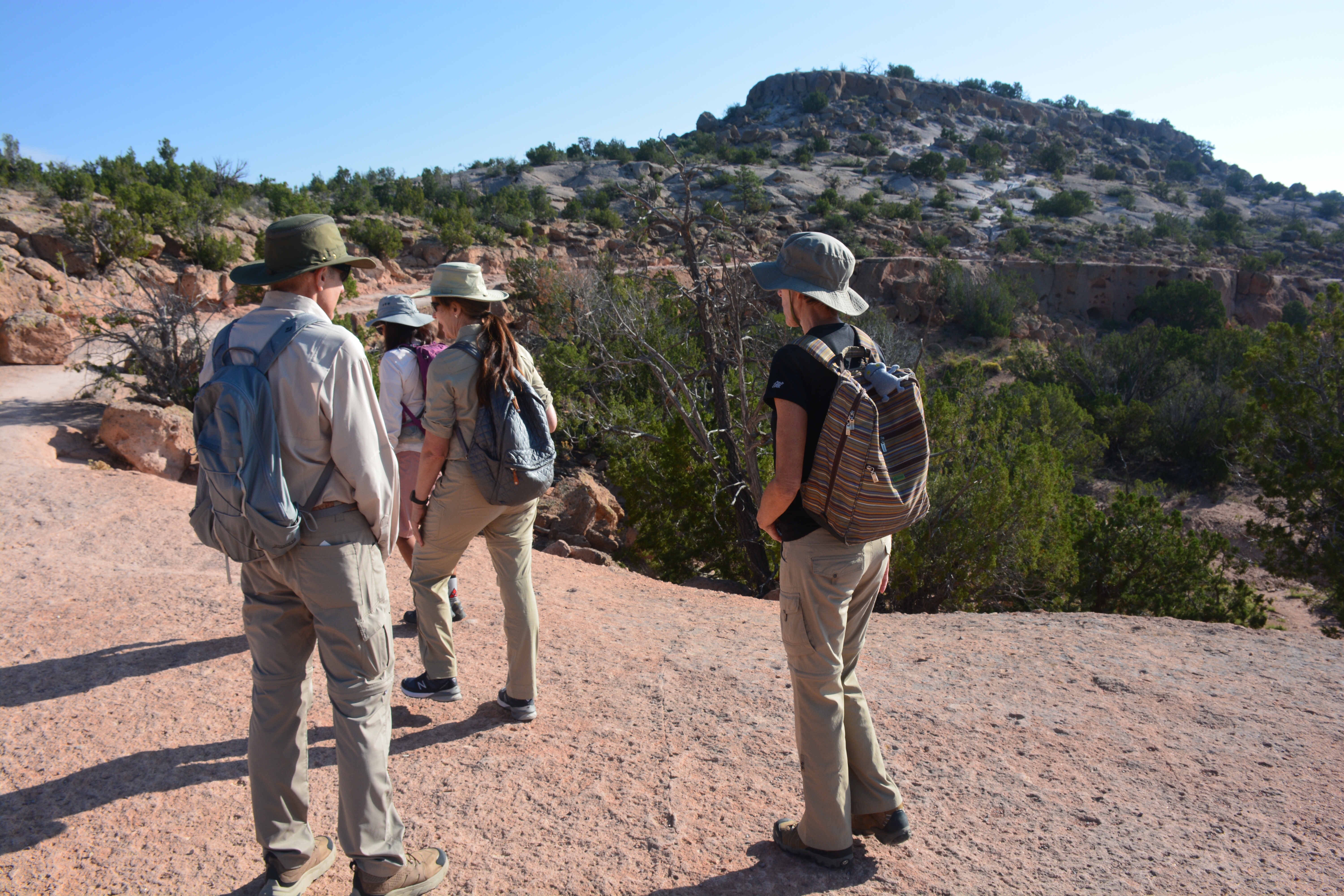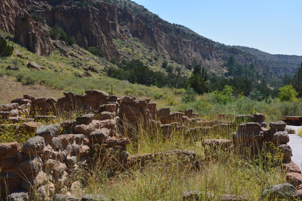 Our Bandelier tour was again arranged through Heritage Inspirations. We met our tour leader, Mickey, at a nearby hotel at 8:00 am for a roughly 45 minute drive to Frijoles Canyon. A drive of that length is short for this region. The day was like every other one in which we hiked, clear and hot with temps rising to the low 90s. (The heat is of course going to break as we leave.)