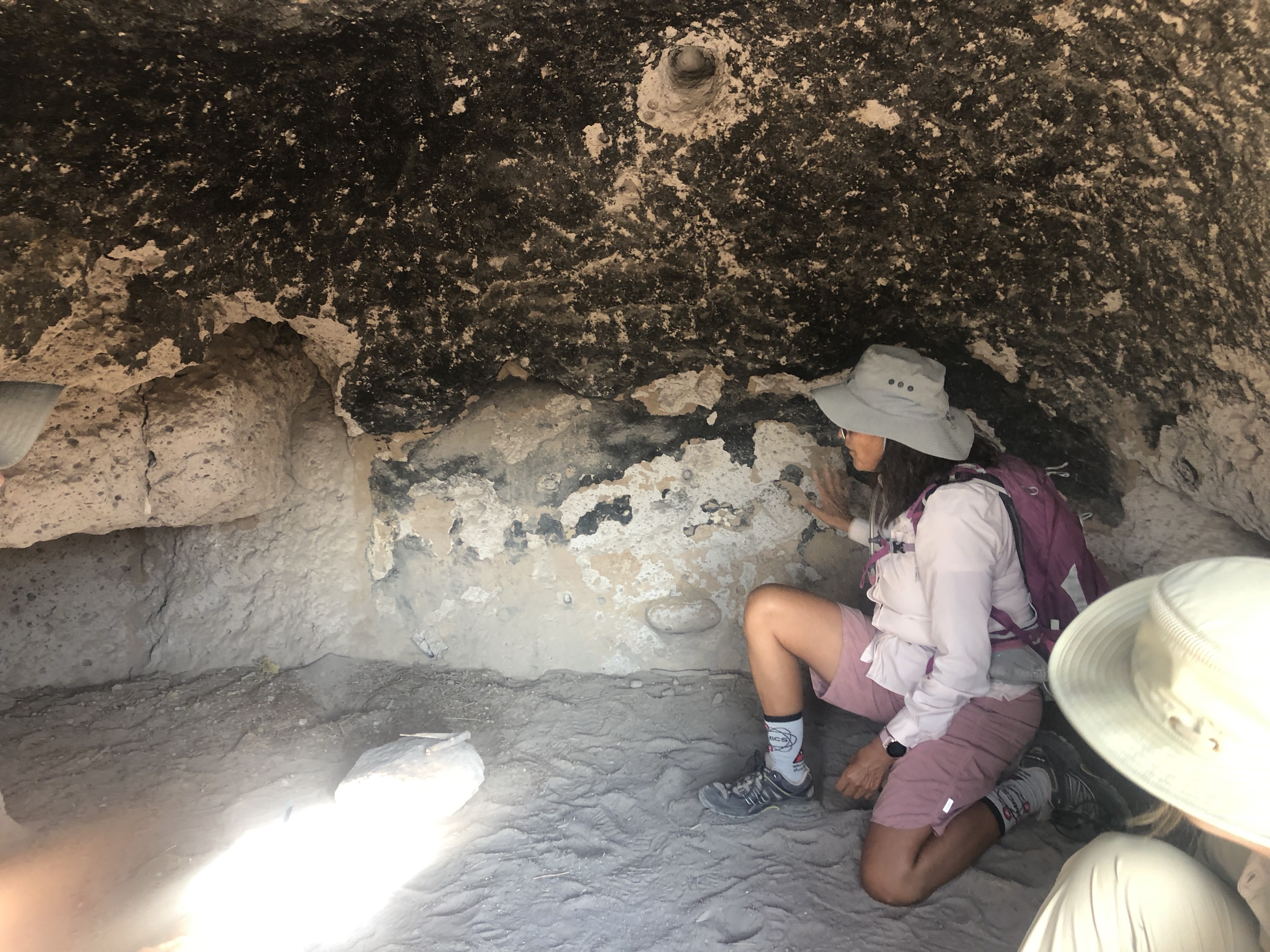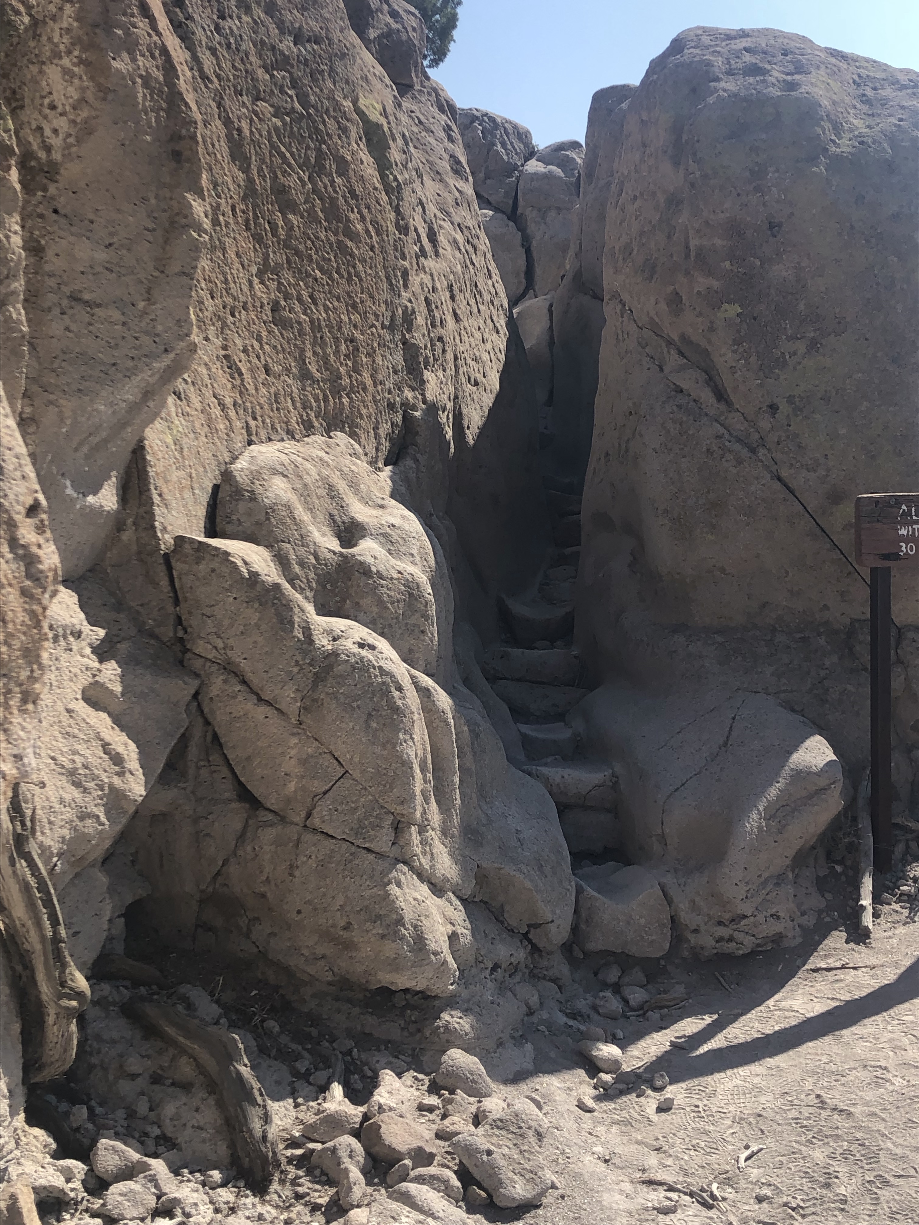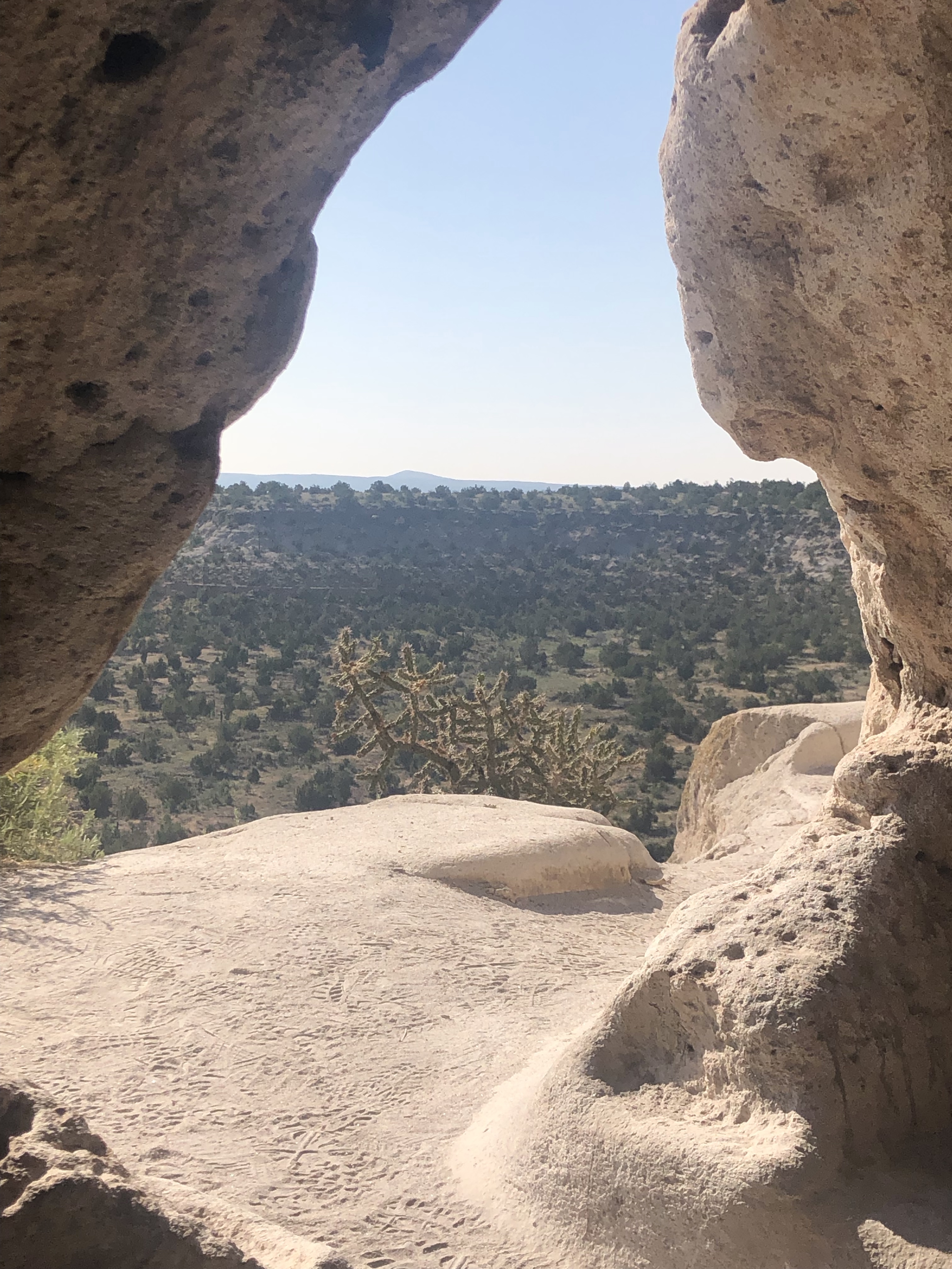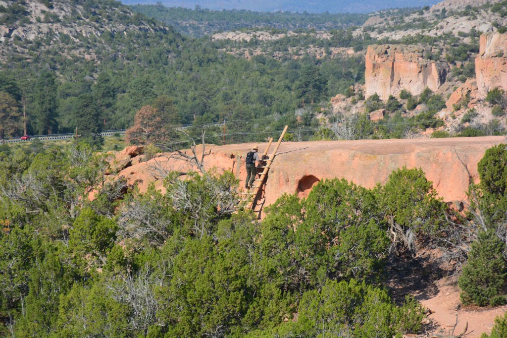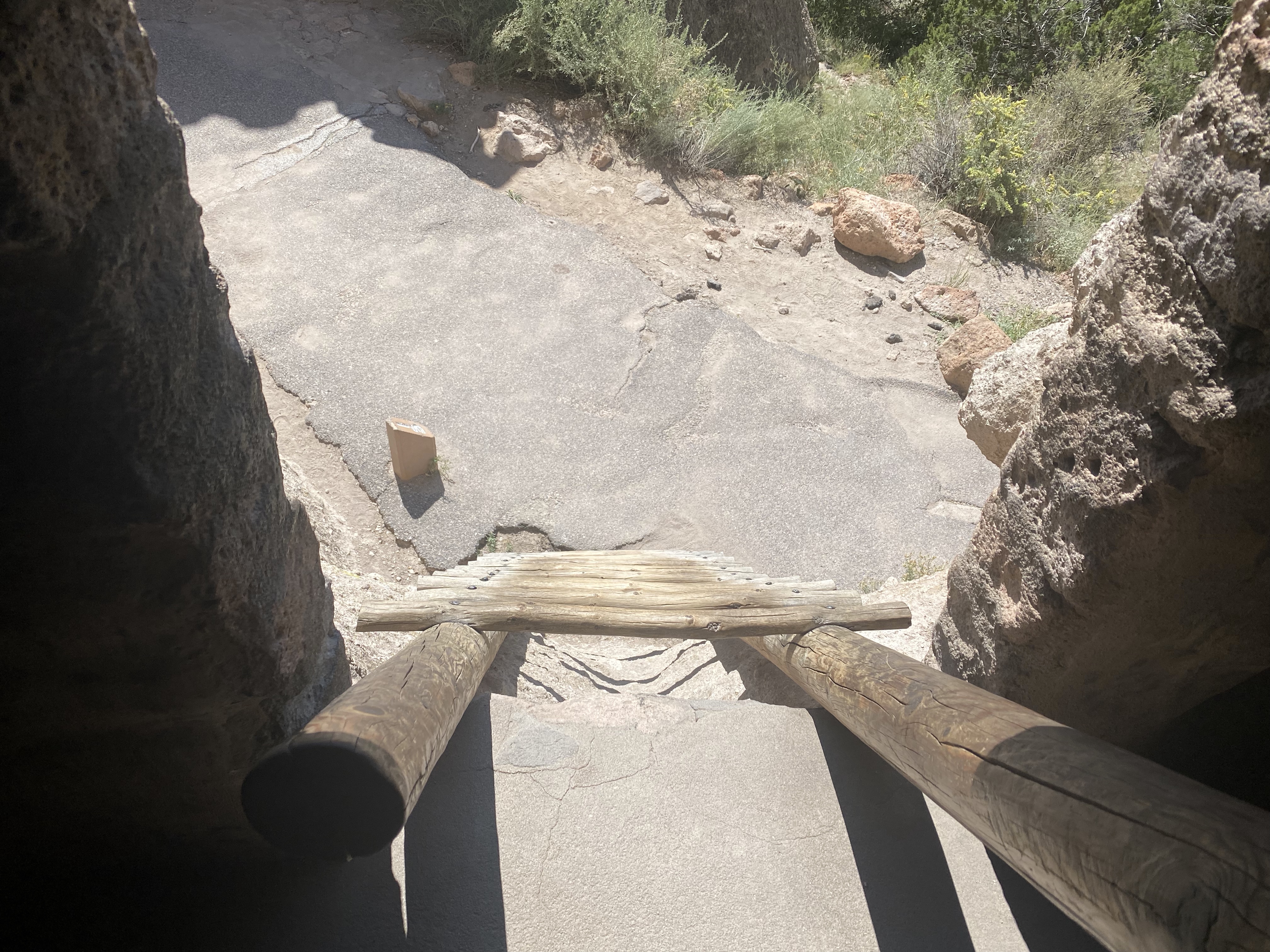 The hike involved climbing up and down some ladders to ultimately reach the top of the mesa, where there is evidence of several ancestral homes dating to roughly 1200 AD. (The ladders are sturdy and not as daunting as would appear from the photos.) The second half of the visit at Bandelier is more of a stroll. There is a paved route that was created during the Depression by the WPA and is maintained by the Park Service. At Bandelier you can see kivas and other structures similar to what we viewed at Chaco Canyon, though newer. It is believed people migrated from Chaco to the Bandelier region when the spring-fed stream that supported the settlement in Chaco dried up.