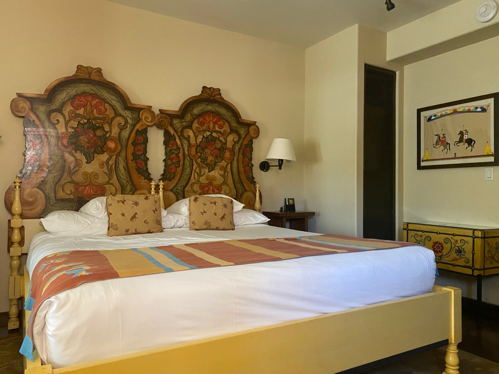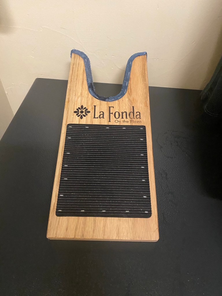 Our next hotel, La Fonda on the Plaza, was an unequivocal success. Our comfortable king room had a separate sitting area and New Mexican art throughout. The headboard on our bed gives a taste. (Jim would have brought his cowboy boots if he knew the hotel would provide a boot jack!)