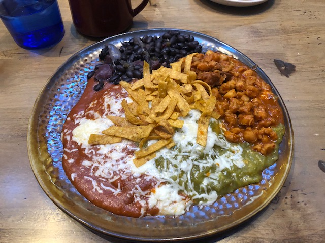 In preparing for the trip I had read a lot about the red and green chiles that would be on offer. But I wanted to have a dish with “Christmas” chiles, i.e., both red and green. I finally got it at my last breakfast at La Fonda.