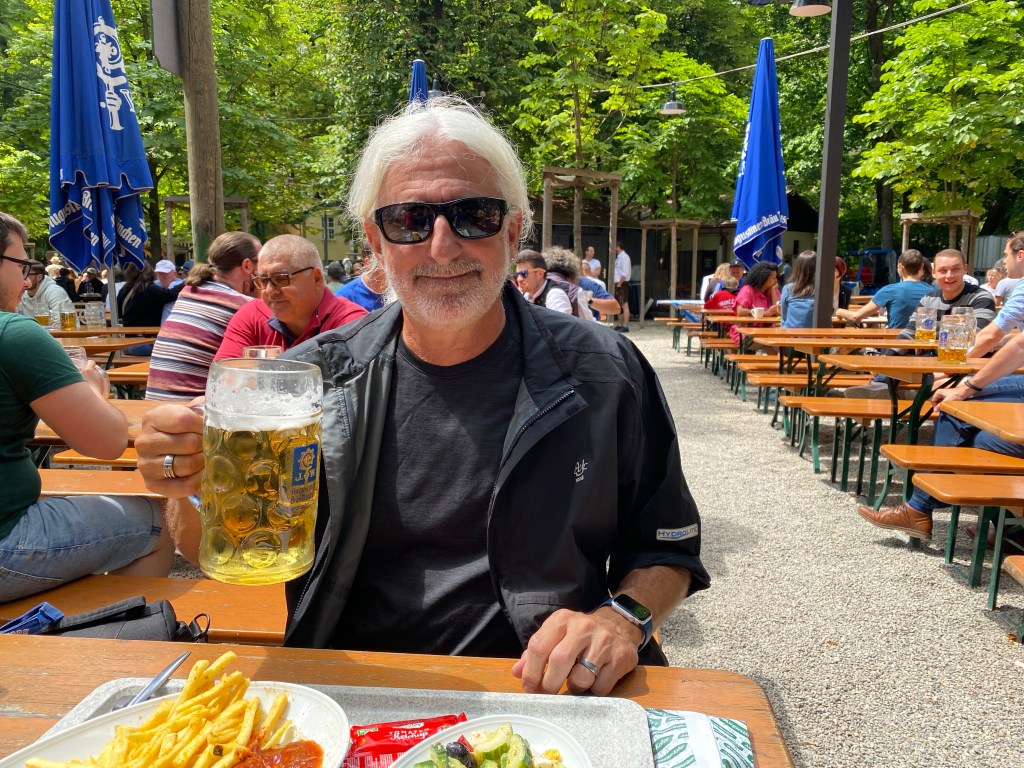 After the Dachau tour we returned to the beer garden adjacent to where we had our first night’s dinner for a German sausage and, of course, a couple more large beers. There was a band playing traditional Bavarian music and hundreds of people picnicking. As we noted in our first post, Thursday was Father’s Day and that seems to mean guys get dressed up in their Lederhosen and other traditional garb and drink all day. At least that was the gist as far as we could tell. But everyone seemed to be having a good time. It’s interesting that at least one family had brought their own food and set up for a day-long picnic, which was OK so long as they bought beers. Being Germans, they obliged.