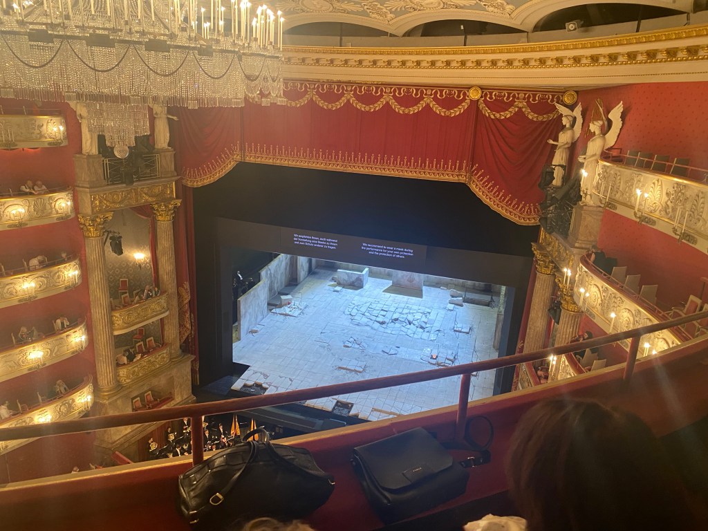 After the first two acts there was a 45-minute break where you could grab a drink or a snack. Prices for a couple of drinks were actually fairly reasonable, not the ridiculous gouging you experience at at Broadway theatre. We went back for the third act of the performance after some debate. That act feature a lot of naked men lying around a pool in Carthage, with singing by the soprano playing the queen and another playing her sister. There was a brief curtain for costume changes, such as it was, at which point we decided to make our exit. The opera house is a very large and beautiful building.