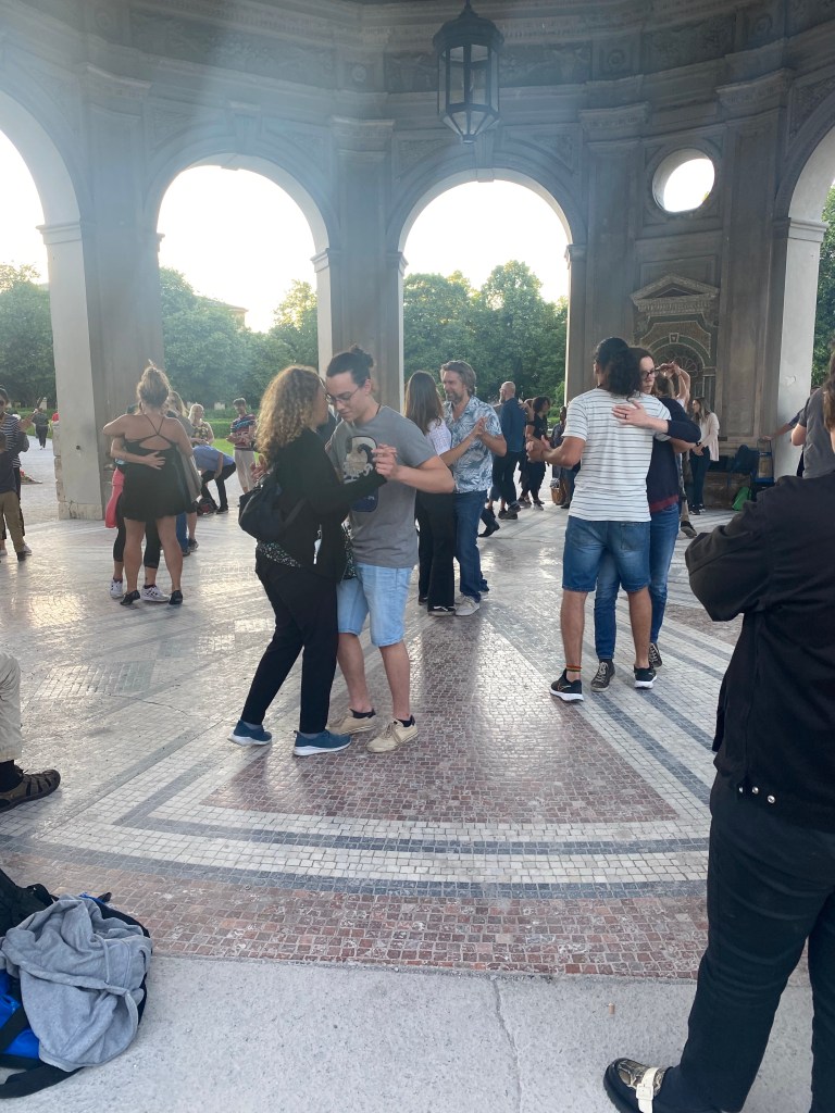 After leaving the theater we strolled up to the nearby Hofgarten, which is the gateway from the old part of the city to the more expansive Englisher Garden, which we may visit on Saturday. While there we briefly watched some people trying to tango under a cupola. It brought back memories of our various and so far unsuccessful attempts to master that dance.