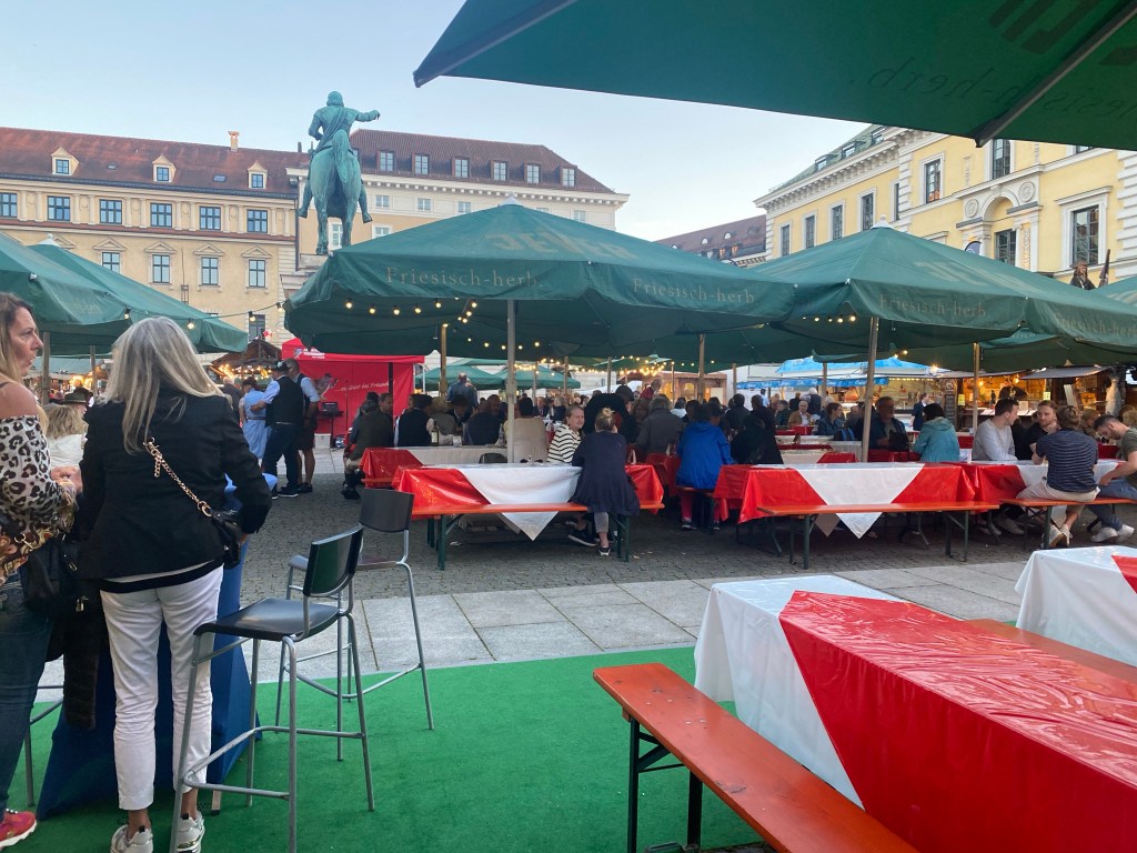 We were strolling back to our hotel when we happened upon what looked like a street carnival that occupied one city block. It featured faux pirate-ship stalls that sold various seafood and other eats. (On a tour the following day we learned that operators of the stalls were from Hamburg, which is northern Germany and much closer to the sea.) We snacked on a flatbread topped with sliced, cooked salmon and grabbed two glasses of wine from an Austrian winery that was selling its wares. The entertainment featured a rather fat old guy with a captain’s hat crooning along to various recordings. That and various guys in Lederhosen wrapping up their Father’s Day with vodka shots. It’s one of those you have-to-see-it-to-believe-it moments.