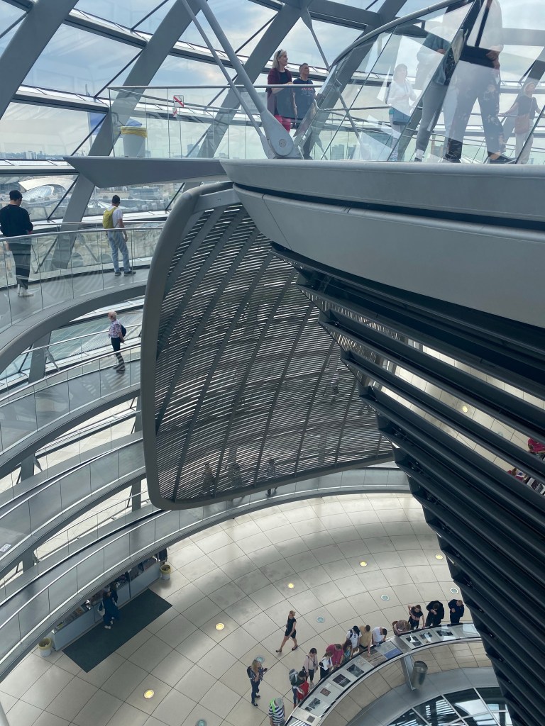 After our gallery tour, it was a short walk to the Bundestag, Germany’s Parliament Building. The building is an architectural and philosophical marvel. Philosophical because it is a glass dome where average citizens can literally watch Parliament at work below. Architecturally, not just because it’s impressive and allows visitors a sleek, twirling walkway with 360 degree views of Berlin, but also for how environmentally conscious it is. For example, the transparent glass dome brings in natural light, but there is a huge ‘shade’ that moves into place to keep the building cool. The open dome allows in rain that is funneled into the building and re-used. Pretty cool.