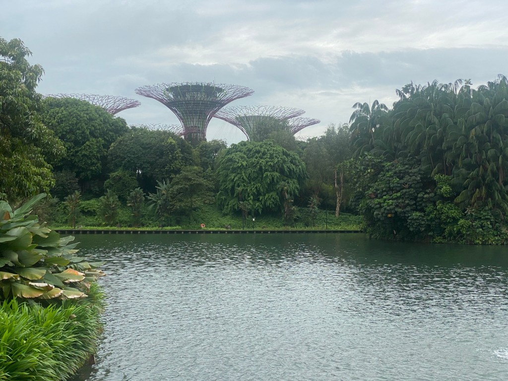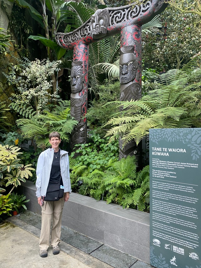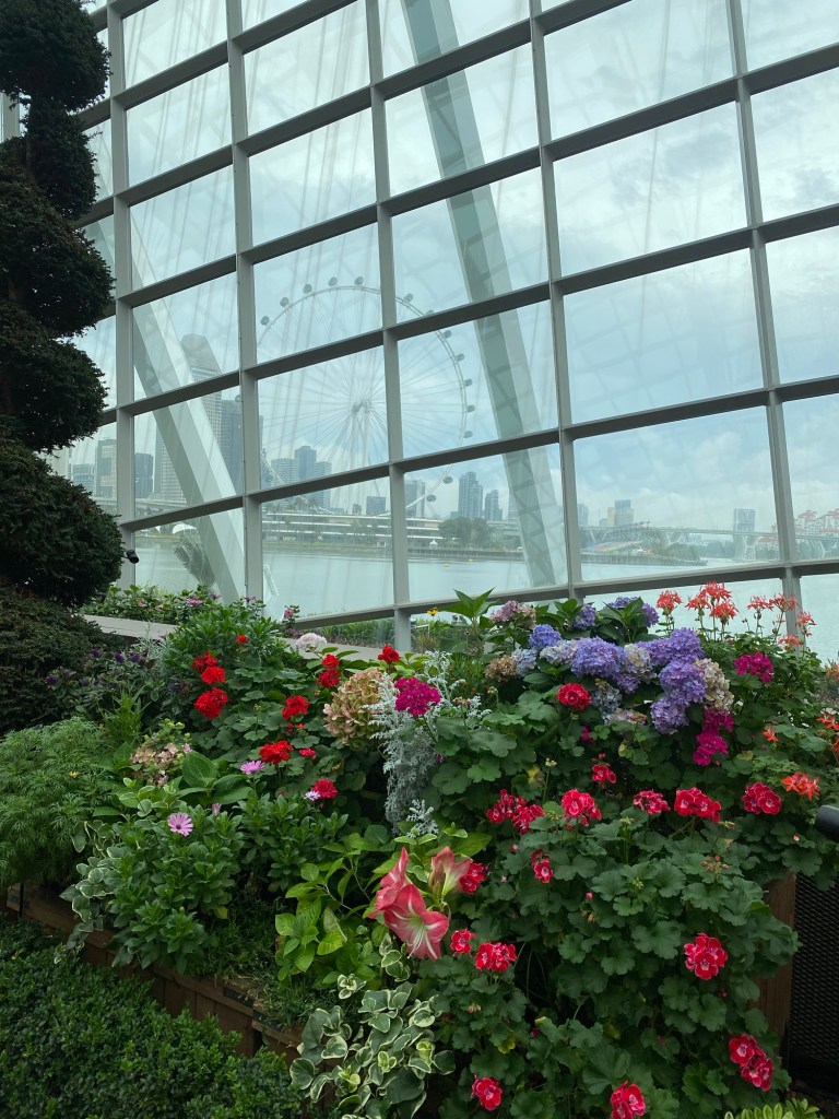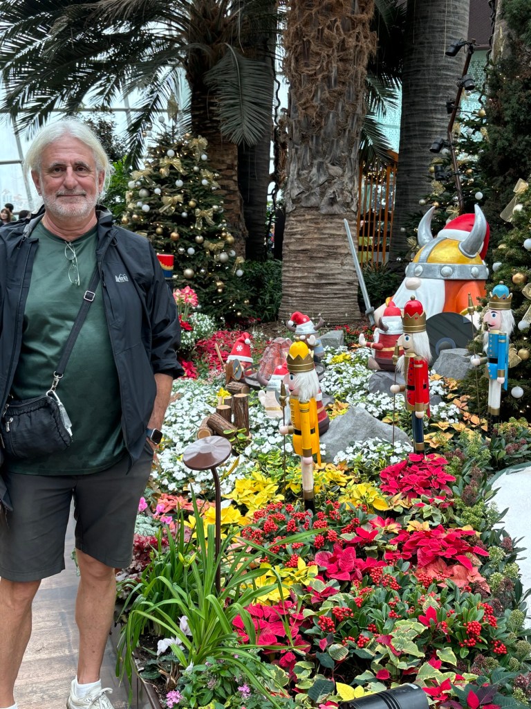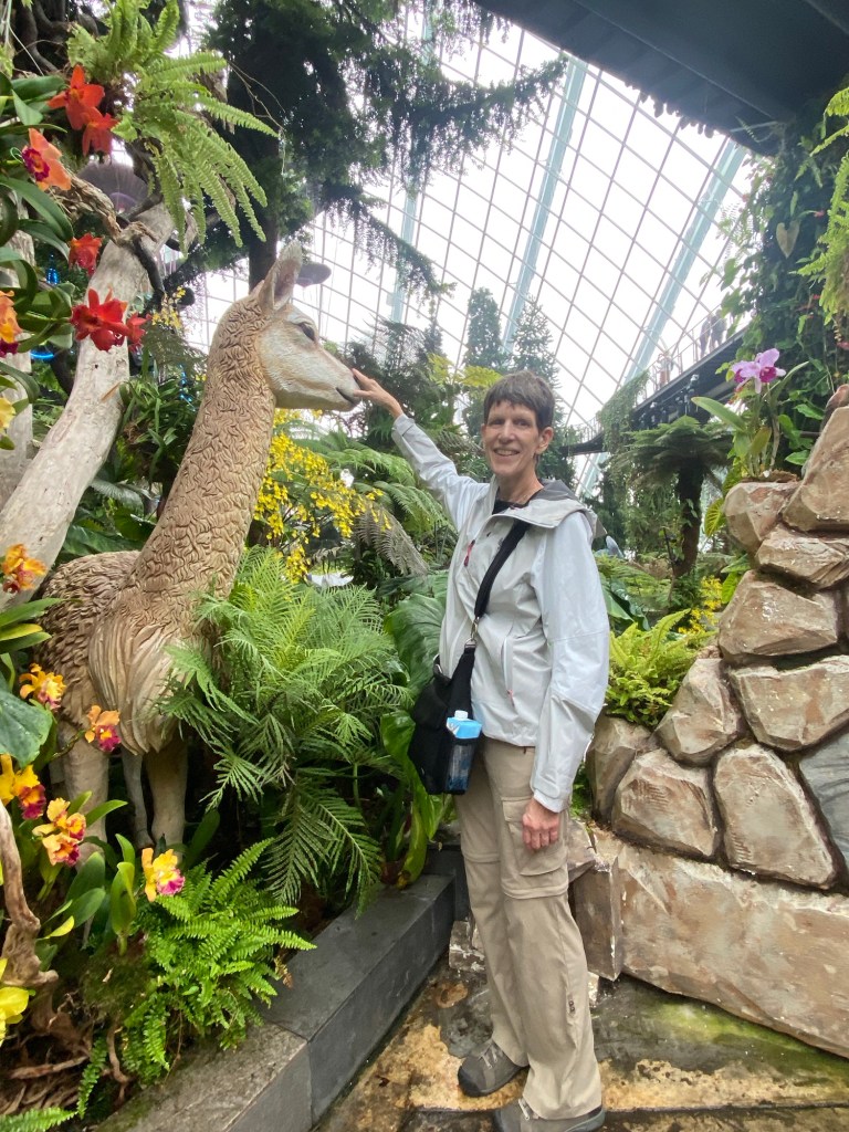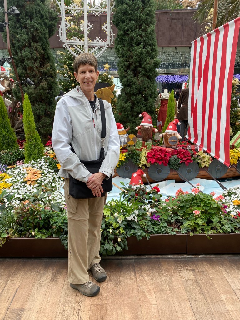 The reason for heading there is that two featured conservatories, the Rain Forest Dome and the Flower Dome, are enclosed and thus enjoyable on a rainy day. There’s an entry fee for those exhibits that came out to US $52.75 for the two of us, about in line with what we would likely be charged at other botanical gardens. Both were enjoyable to visit, but the most fun was the Flower Dome because it still had its Christmas display in place. It featured an homage to Scandinavian/Viking culture at Christmas. Think Gnomes and the like. Weird to look at when one is in Asia, suffice it to say.