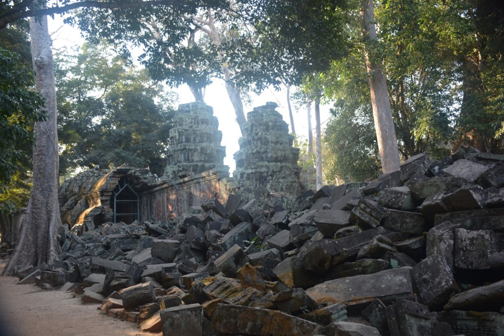 We began with a visit to the Ta Prohm temple. It was “re-discovered” in the 1800s by the French, though local people lived in the area and knew of its existence. It was covered in dense jungle vegetation and huge deep-rooted strangler fig trees. The roots look like they are dripping over the remaining buildings and walls.