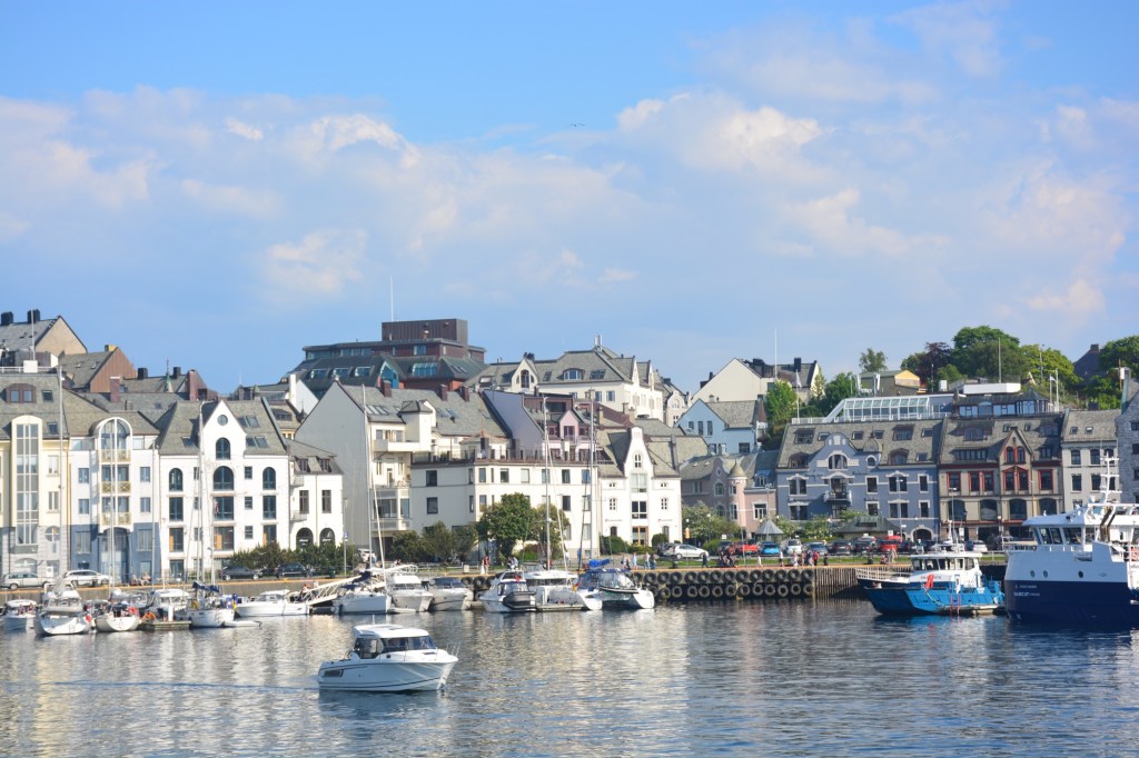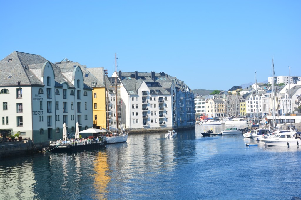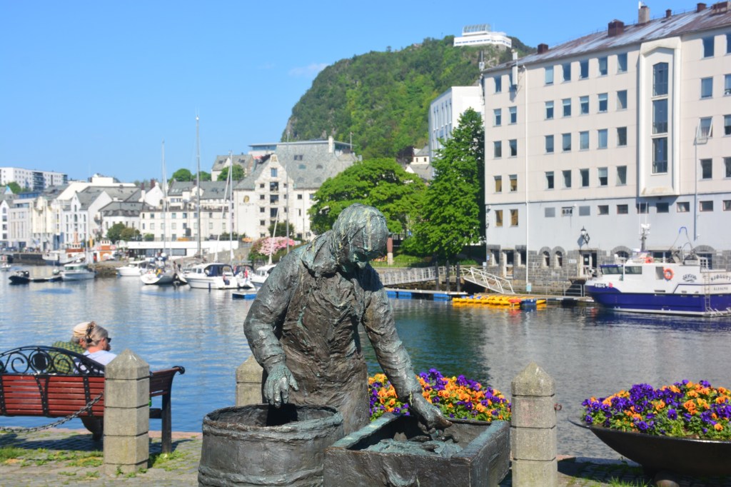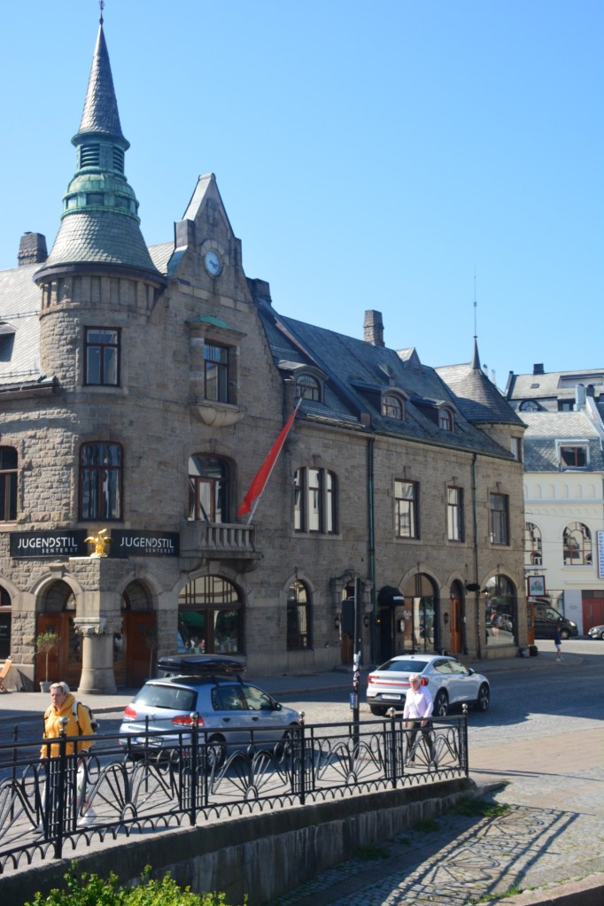We found the port area to be more pleasant than Bergen because of the smaller crowds. Alesund also seemed to do little things better. The cafes that ring the harbor have outdoor seating near or facing the water, unlike in Bergen. The observation viewpoint on a hill overlooking the town is reachable on foot, via a hop-on-hop-off tour bus, or tram. We walked. The 418 steps didn’t seem that daunting after our earlier trek near Oye.
