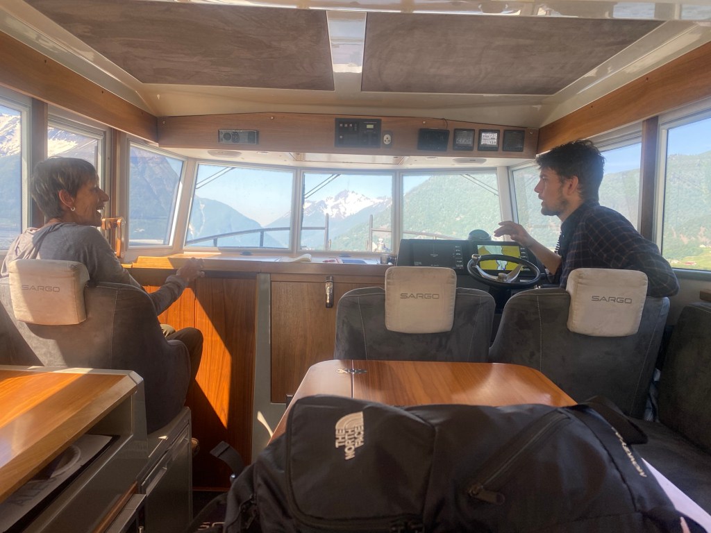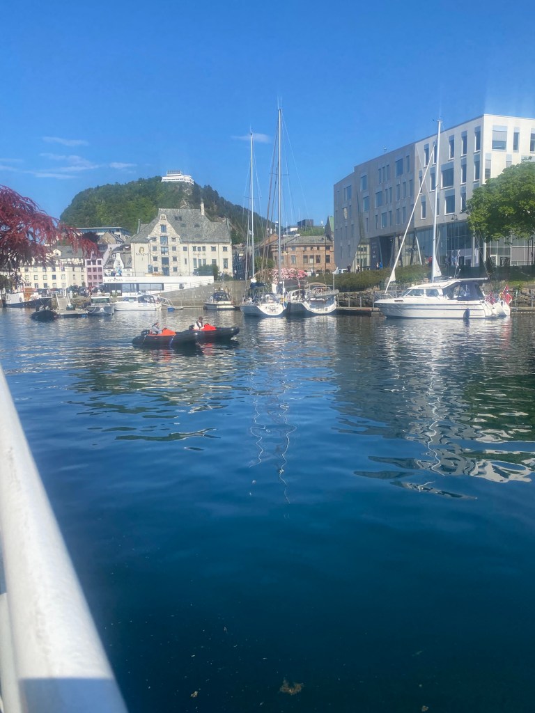 Alesund is where we boarded our boat. The Havila Pollux is a coastal ferry with overnight accommodations. It runs from Bergen to Kirkenes, and back again. I know, we said earlier we weren’t that into cruises, but this one checks the important boxes for us. It’s a smaller boat, with a maximum of 500 overnight guests. It can also carry up to 200 short-term travelers. On this voyage there are only about 250 overnight passengers because it is still early in the summer season. Most appear to be Germans.