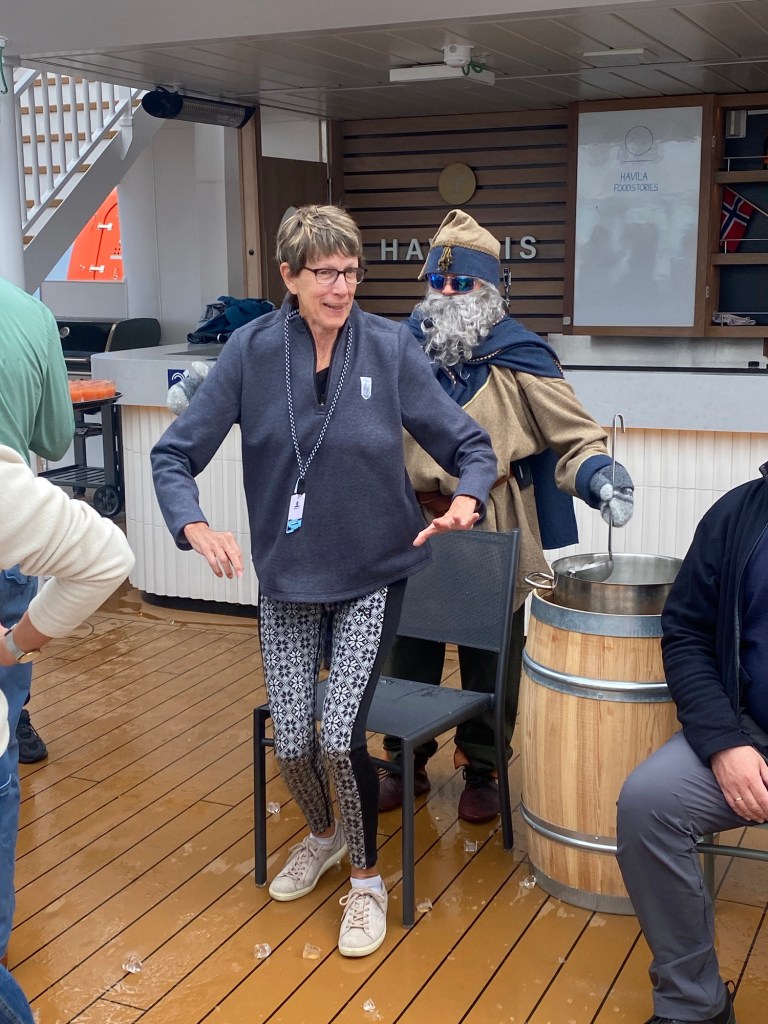 The vessel is new. It has two restaurants, a quick-service cafe, and two bars. The food has been good, but like elsewhere in Norway the drinks are expensive. The ship had been out of service for some repairs but came back online just in time for our voyage. Unlike a true cruise ship there is no casino and no staged entertainment, though the excursion staff will do so silly things on board. One was a ceremony that involved pouring ice down people’s backs to mark crossing the Artic Circle.