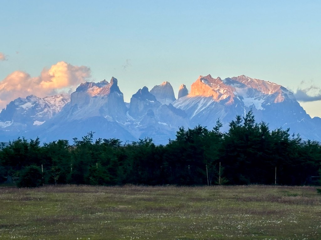 Torres del Paine means “towers of blue,” and it perfectly describes the stunning blue colors of the sky, the granite of the mountains, the glaciers and glacial lakes. Although our hotel was located a short drive outside of the park we had a perfect view of the famous three spires rising from the Paine Massif, and we were treated to a spectacular sunset on our first night.